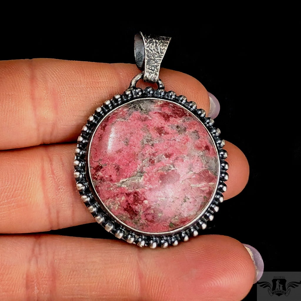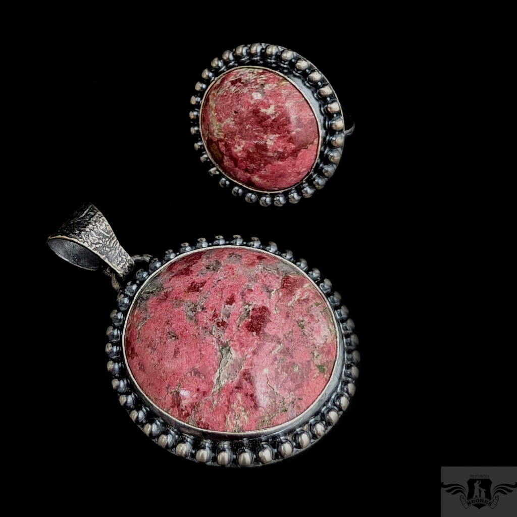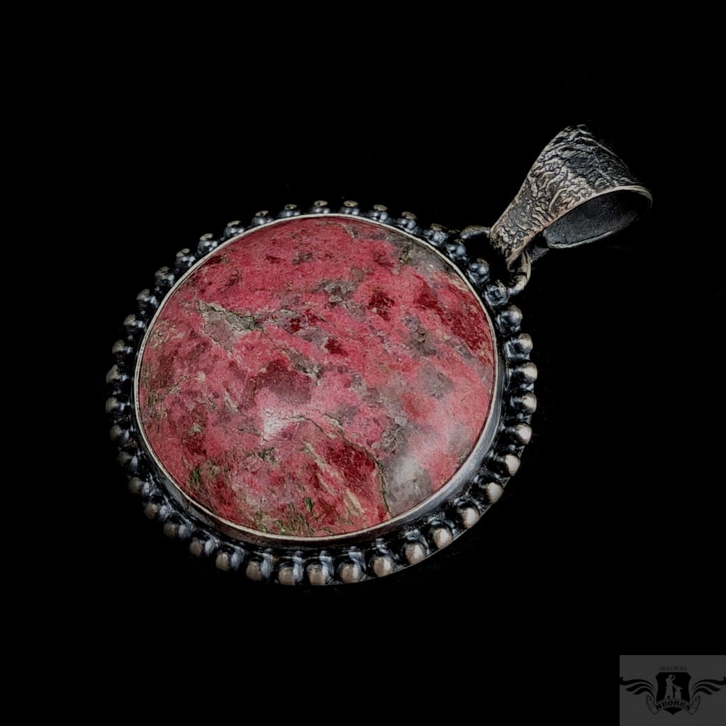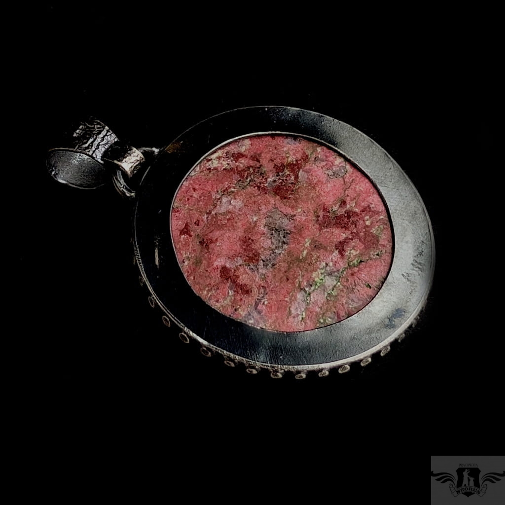 Wisior w stylu retro z rzadkim minerałem o nazwie thulit , bedącym niezwykłą, różową odminą zoizytu pochodzącą z Norwegii. Kamień oprawiony w oksydowaną, srebrną ramę. Próba srebra 925. Średnica oprawy 36 mm.Z krawatką 48 mm. Wisior zostanie zapakowany w ozdobne pudełeczko. Polecam piękny pierścień do kompletu.