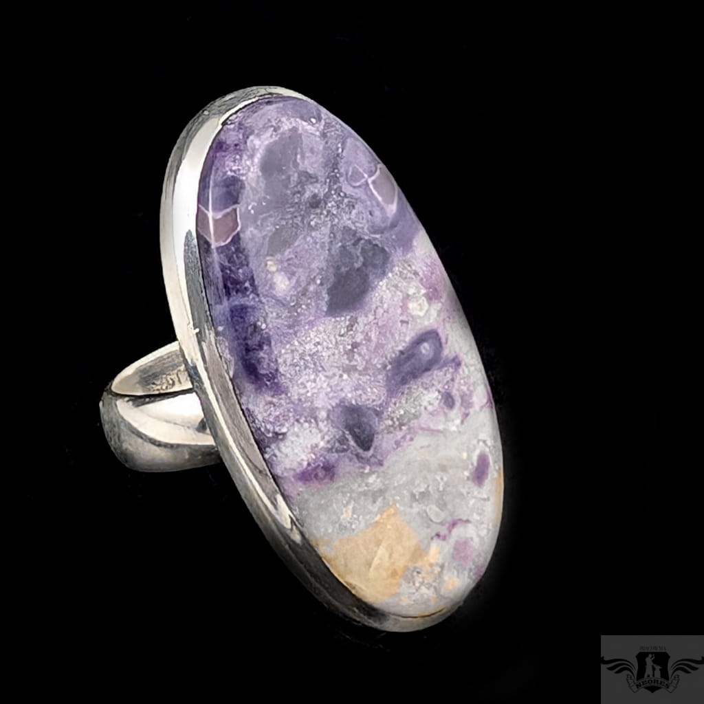 Pierścień wykonany ze srebra próby 925 oraz jaspisu Tiffany. Piękne połączenie fioletu i beżowego. Wymiary oprawy kamienia 33 x 17 mm. Rozmiar jubilerski regulowany w wąskim zakresie 14-17. Proszę napisać na jaki dopasować. Waga 10 g. Wykonany przez dostawcę kamieni. Pierścień zostanie wysłany w ozdobnym pudełeczku.