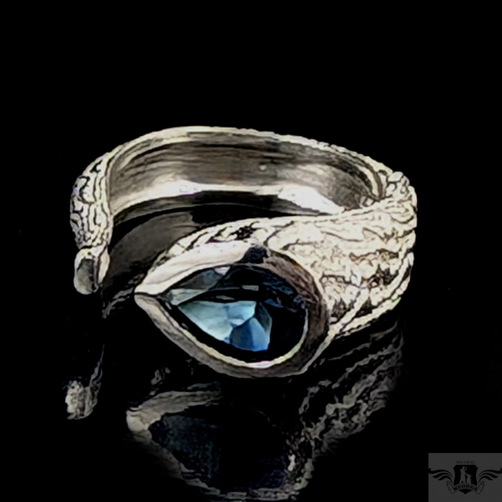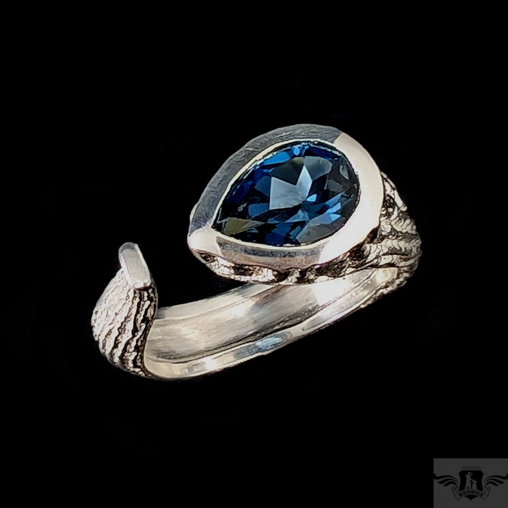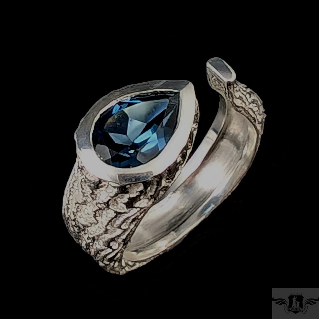 Pierścień z oprawionymi w srebro próby 925 pięknym topazem w odcieniu london blue. Kamień o pięknym szlifie Szerokość obrączki max 7 mm, min. 3 mm.Kamień ma oprawę 13 x 9 mm. Rozmiar jubilerski regulowany w wąskim zakresie 13-18 proszę napisać na jaki ustawić. Waga 6,6 grama. Wykonany przez dostawcę kamieni. Pierścień zapakowany zostanie w ozdobne pudełeczko.