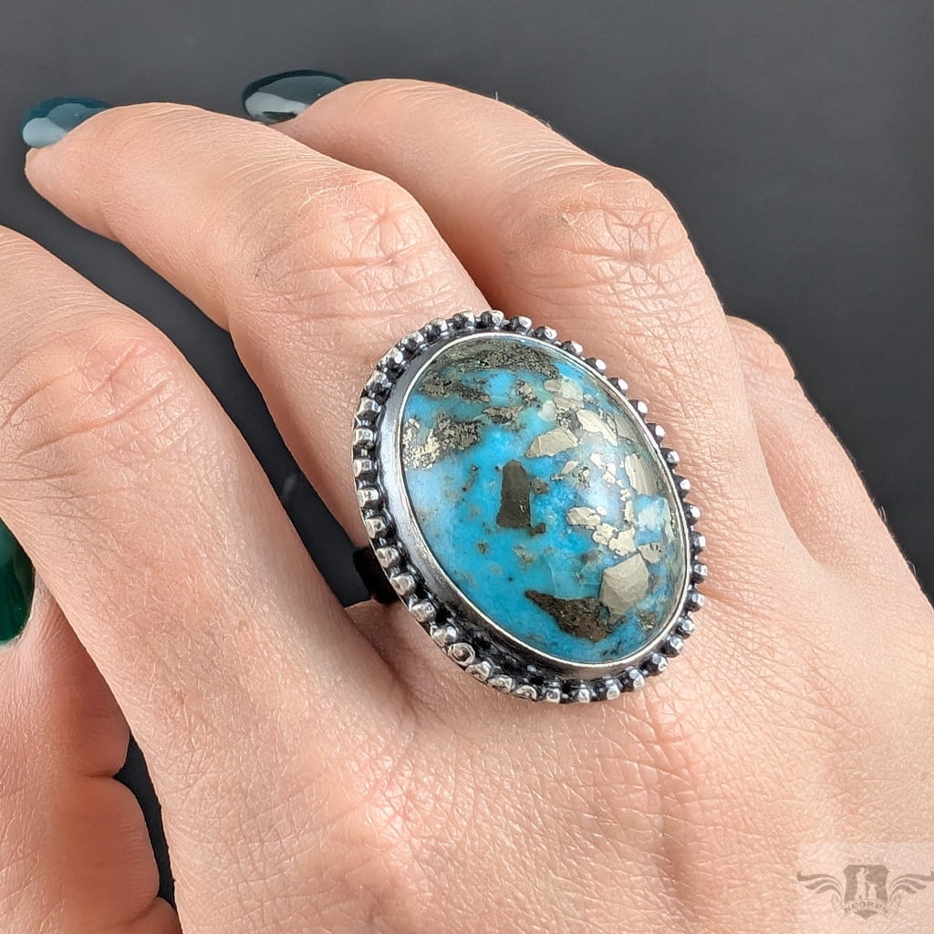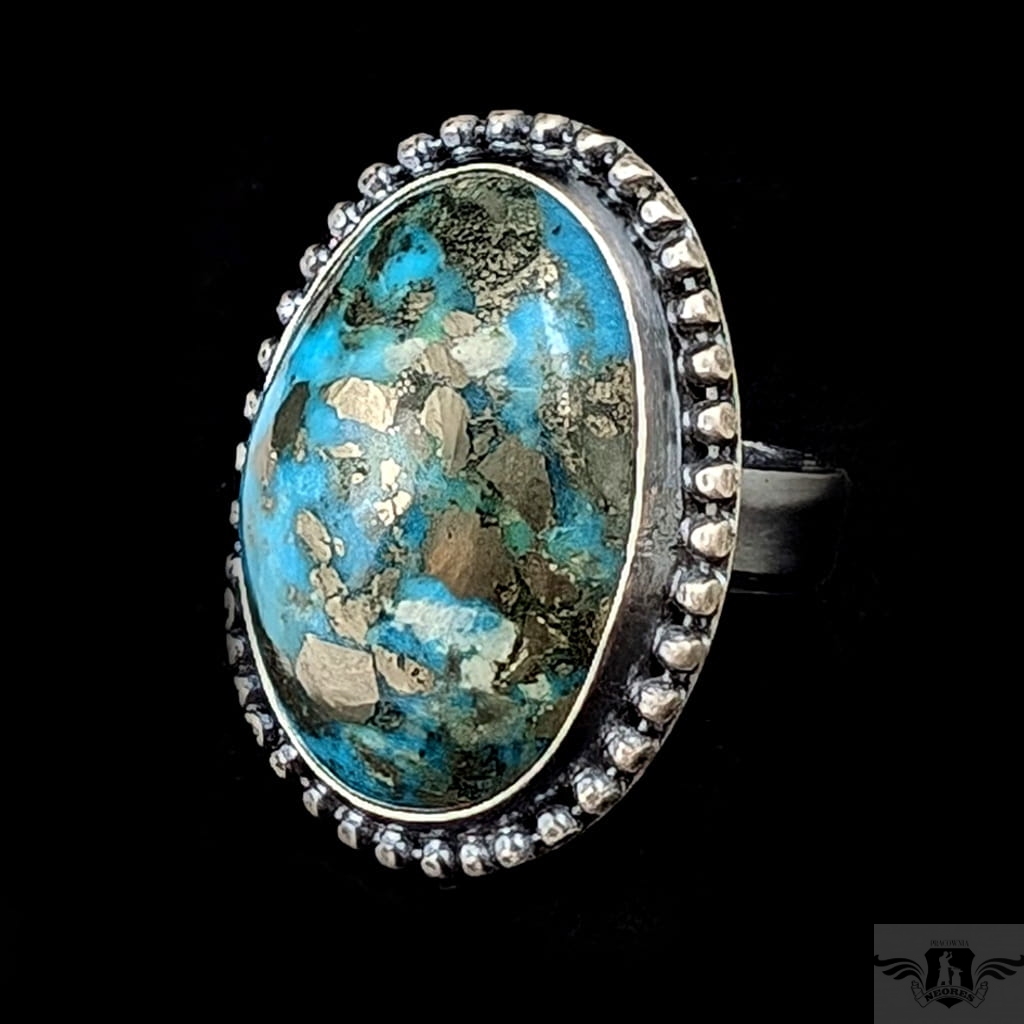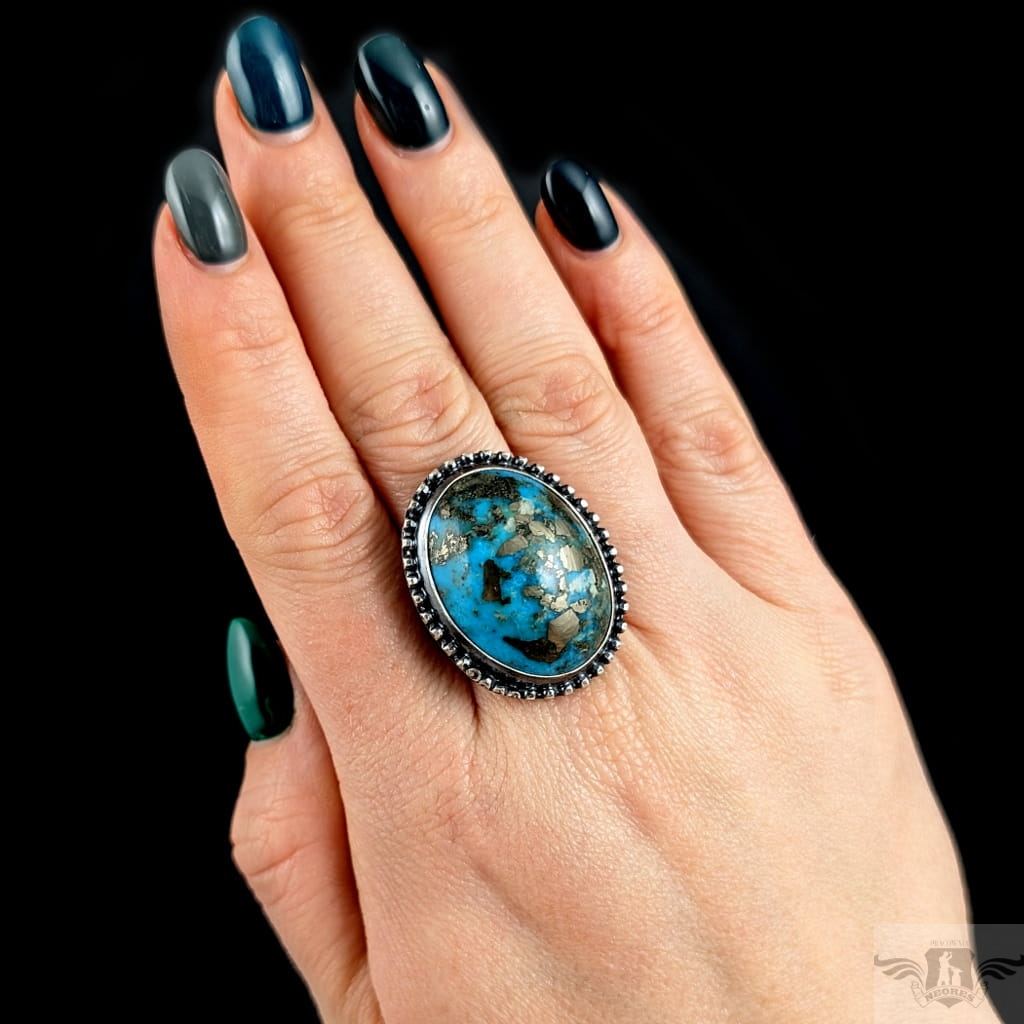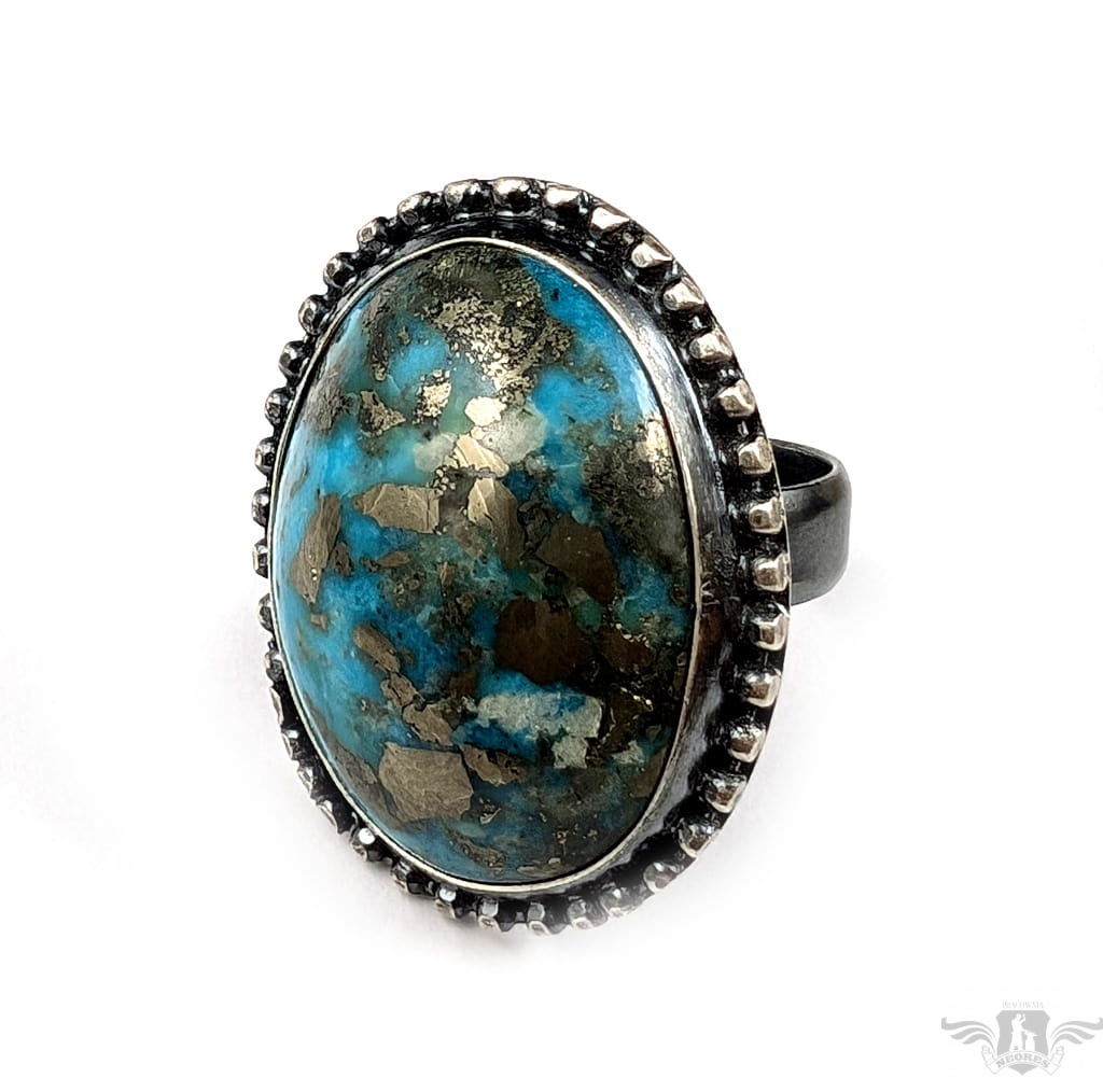 Okazały pierścień wykonany z oksydowanego srebra pr 925 oraz pięknego, naturalnego turkusu z Iranu o zjawiskowej błękitnej barwie. Jest piękny, wygląda jak stare klejnoty z babcinych puzderek. Rozmiar obrączki regulowany, do dopasowania w szerokim zakresie, proszę napisać na jaki ustawić. Oprawa 33 x 25 mm. Waga 16,8 grama. Pierścień wyslany zostanie w ozdobnym pudełeczku