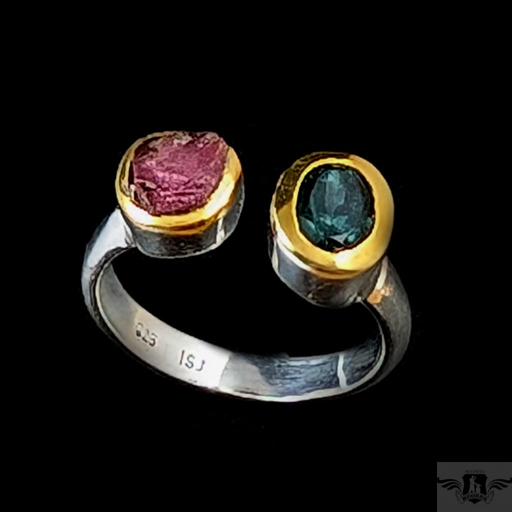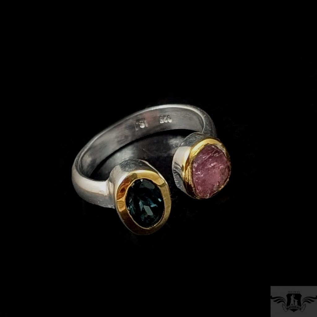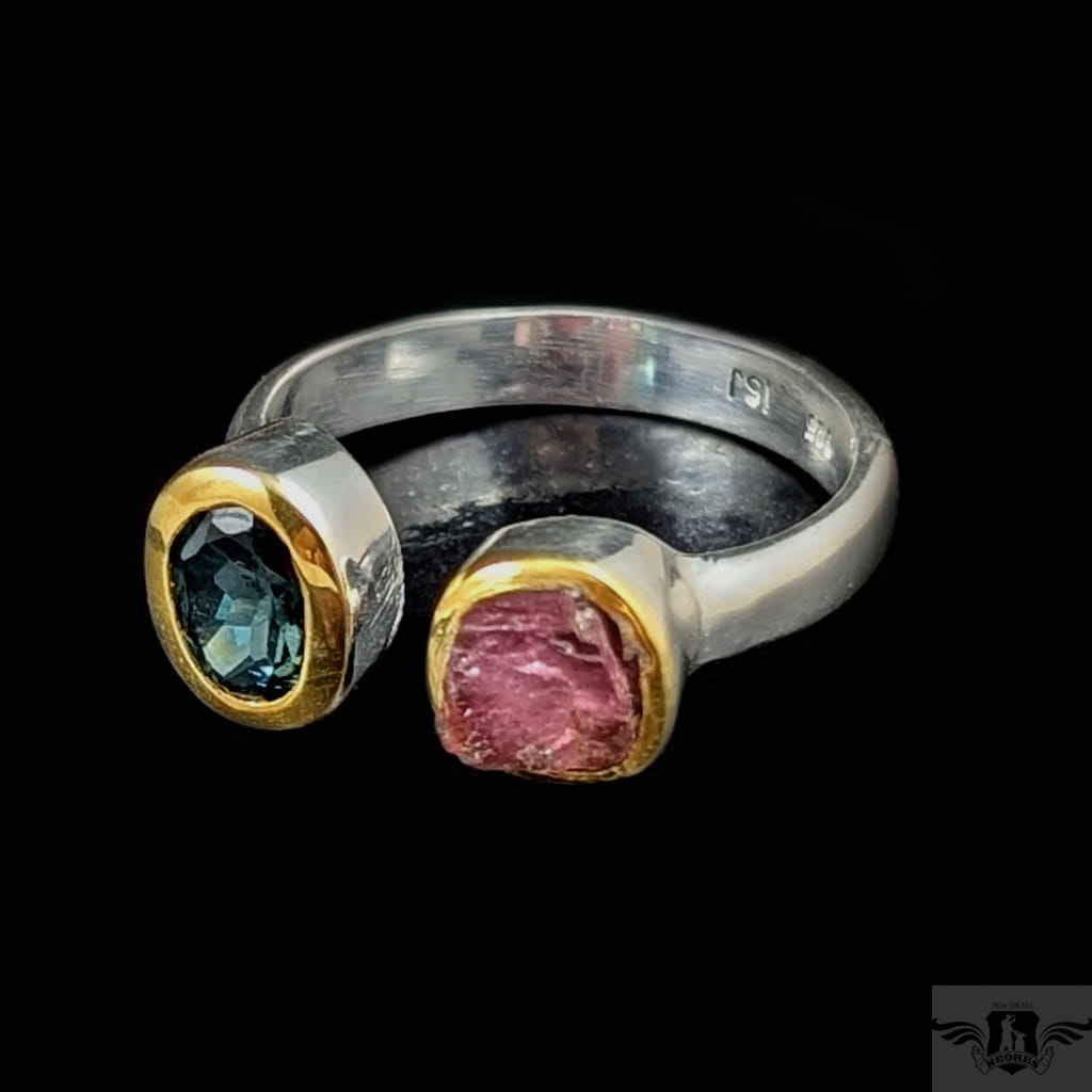Dwa ciekawe okazy turmalinów, o barwie morskiej toni w oprawie 9 x 7 mm oraz różowy, surowy o średnicy oprawy 8 mm. Srebro próby 925, oprawa srebra wokół kamieni pozłacana, to delikatne powłoki, które z czasem mogą się zetrzeć. Rozmiar jubilerski mogę dopasować w zakresie 19-19. Waga 5 g. Wykonany przez dostawcę kamieni, Pierścionek zapakowany w ozdobne pudeleczko.