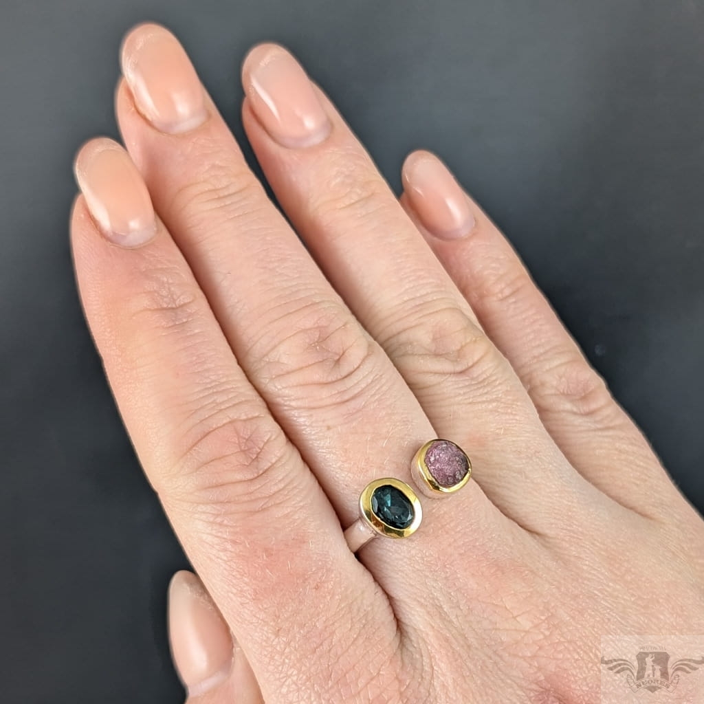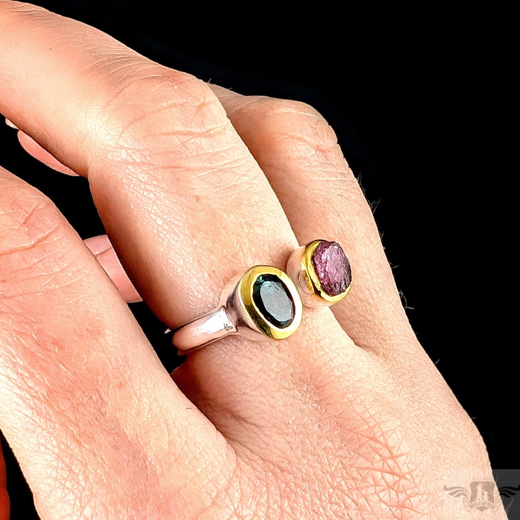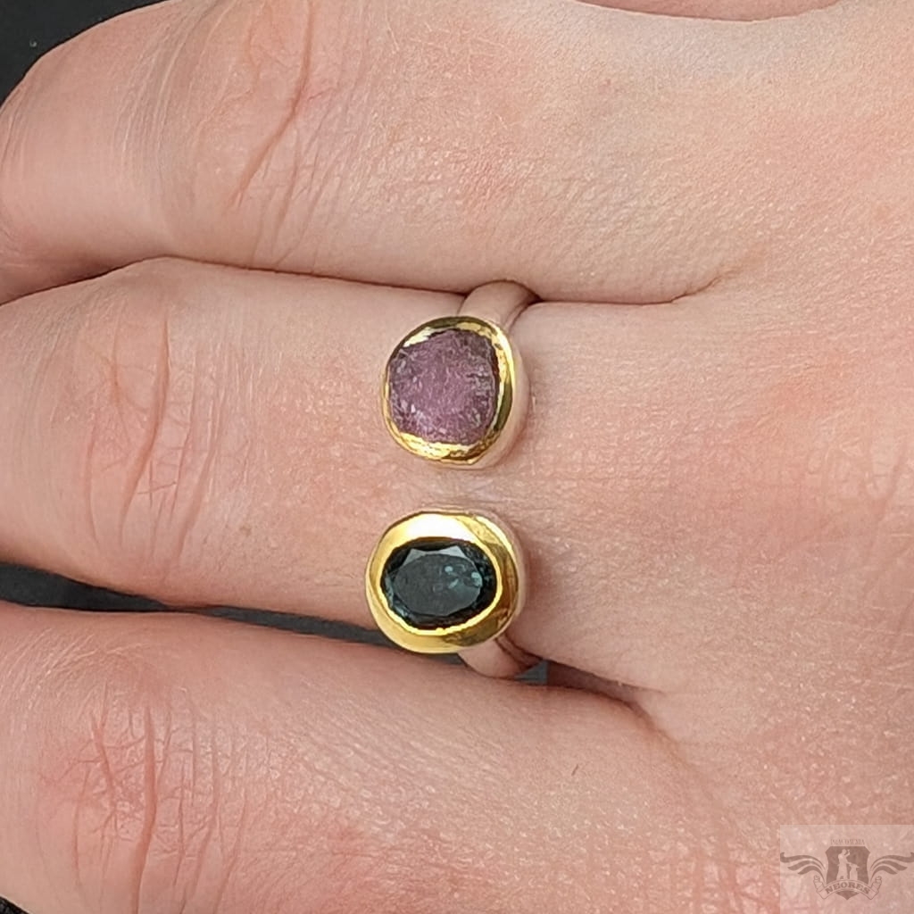 Dwa ciekawe okazy turmalinów, o barwie morskiej toni w oprawie 9 x 7 mm oraz różowy, surowy o średnicy oprawy 8 mm. Srebro próby 925, oprawa srebra wokół kamieni pozłacana, to delikatne powłoki, które z czasem mogą się zetrzeć. Rozmiar jubilerski mogę dopasować w zakresie 19-19. Waga 5 g. Wykonany przez dostawcę kamieni, Pierścionek zapakowany w ozdobne pudeleczko.