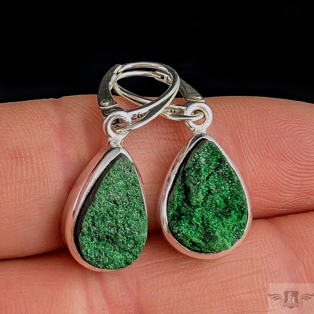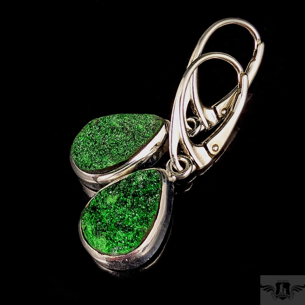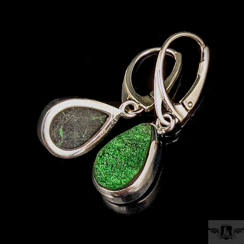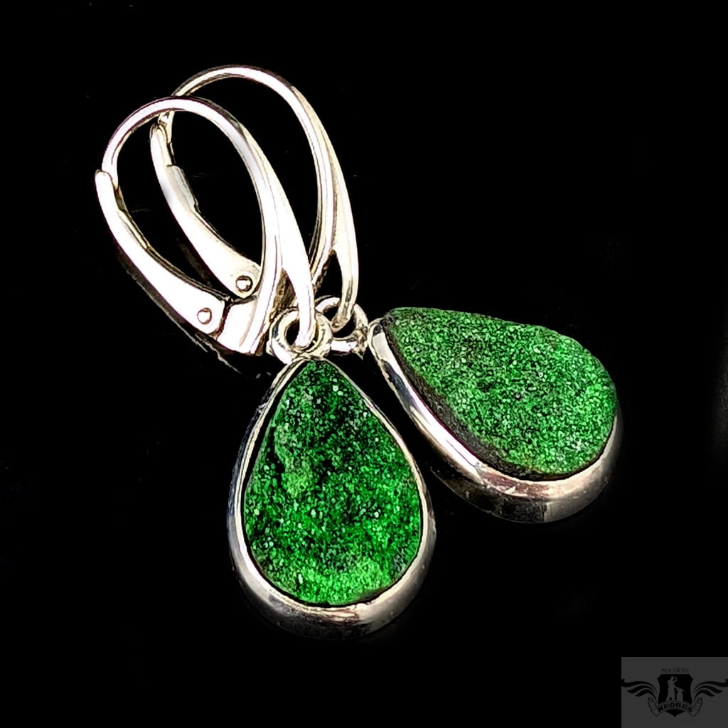 Rzadkie uwarowity oprawione w srebro próby 925. Piękne, soczyście zielone minerały skrzą się na powierzchni licznymi kryształami. Wymiary oprawy 13 x 10 mm, długość z biglami 33 mm, waga jednego kolczyka3,4 g. Kolczyki wysyłamy w ozdobnym pudełeczku.