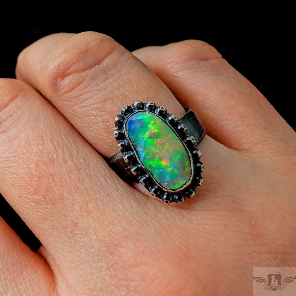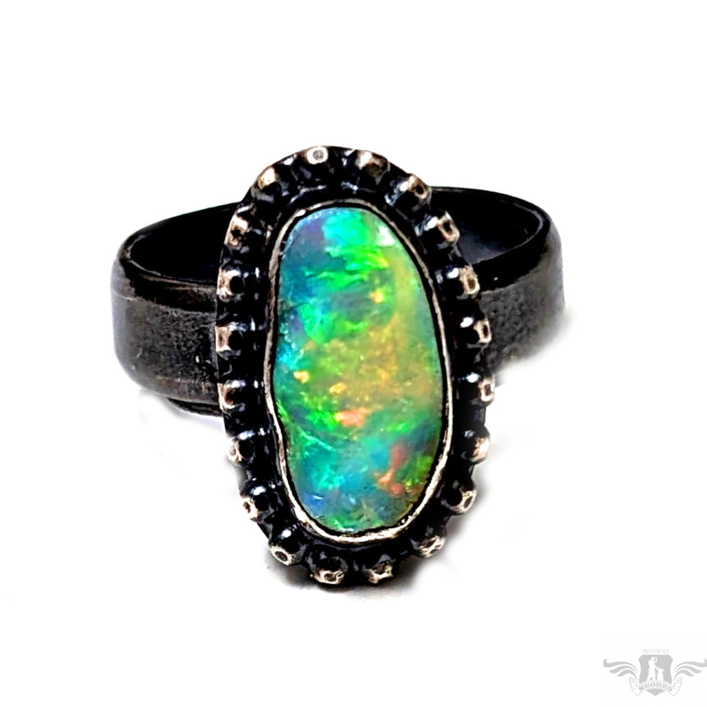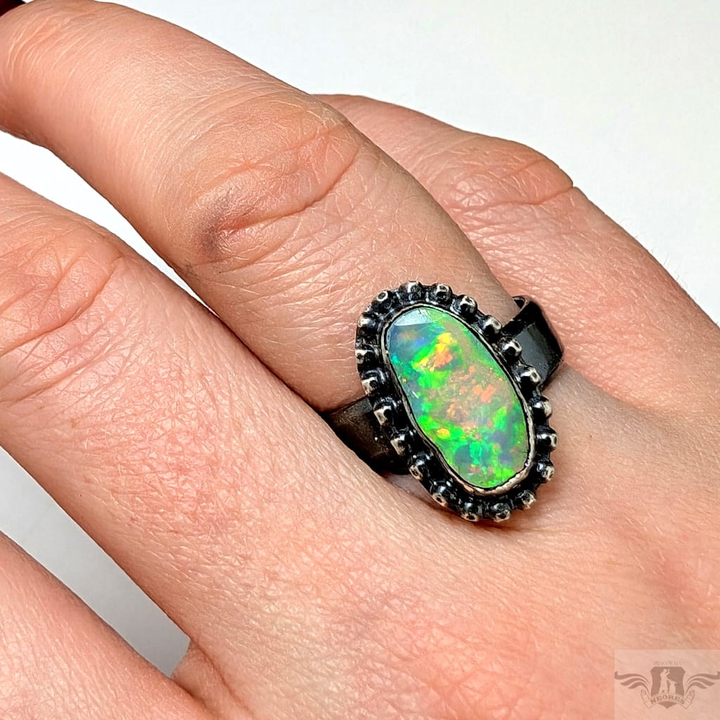 Piękny, surowy pierścień z oprawionym opalem etiopskim Srebro pr.925, oksydowane. Wymiary oprawy 19 x 11 mm. Waga 5,9 g. Obrączka regulowana w szerokim zakresie (9-26), proszę napisać po zakupie, to dopasuję na konkretny rozmiar. Obrączka ma 5 mm szerokości. Zapakowany w ozdobne pudełeczko.