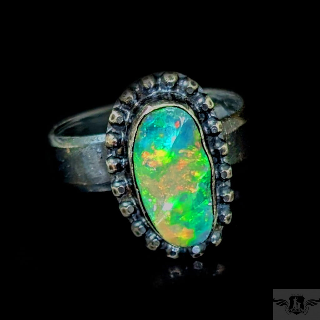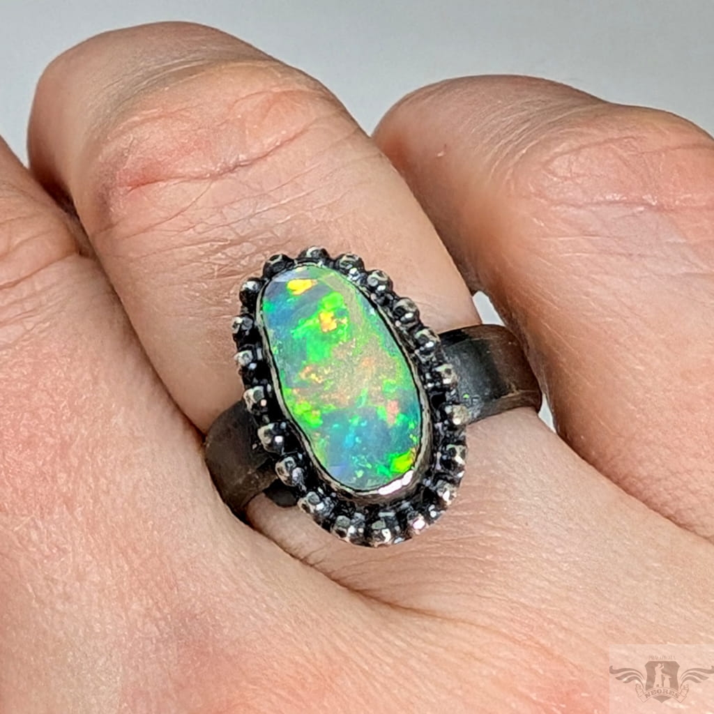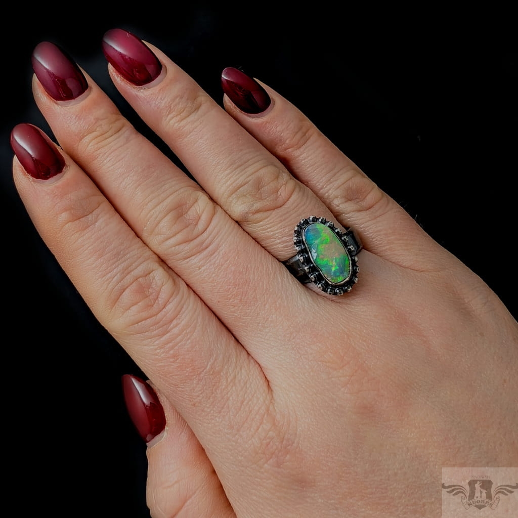 Piękny, surowy pierścień z oprawionym opalem etiopskim Srebro pr.925, oksydowane. Wymiary oprawy 19 x 11 mm. Waga 5,9 g. Obrączka regulowana w szerokim zakresie (9-26), proszę napisać po zakupie, to dopasuję na konkretny rozmiar. Obrączka ma 5 mm szerokości. Zapakowany w ozdobne pudełeczko.