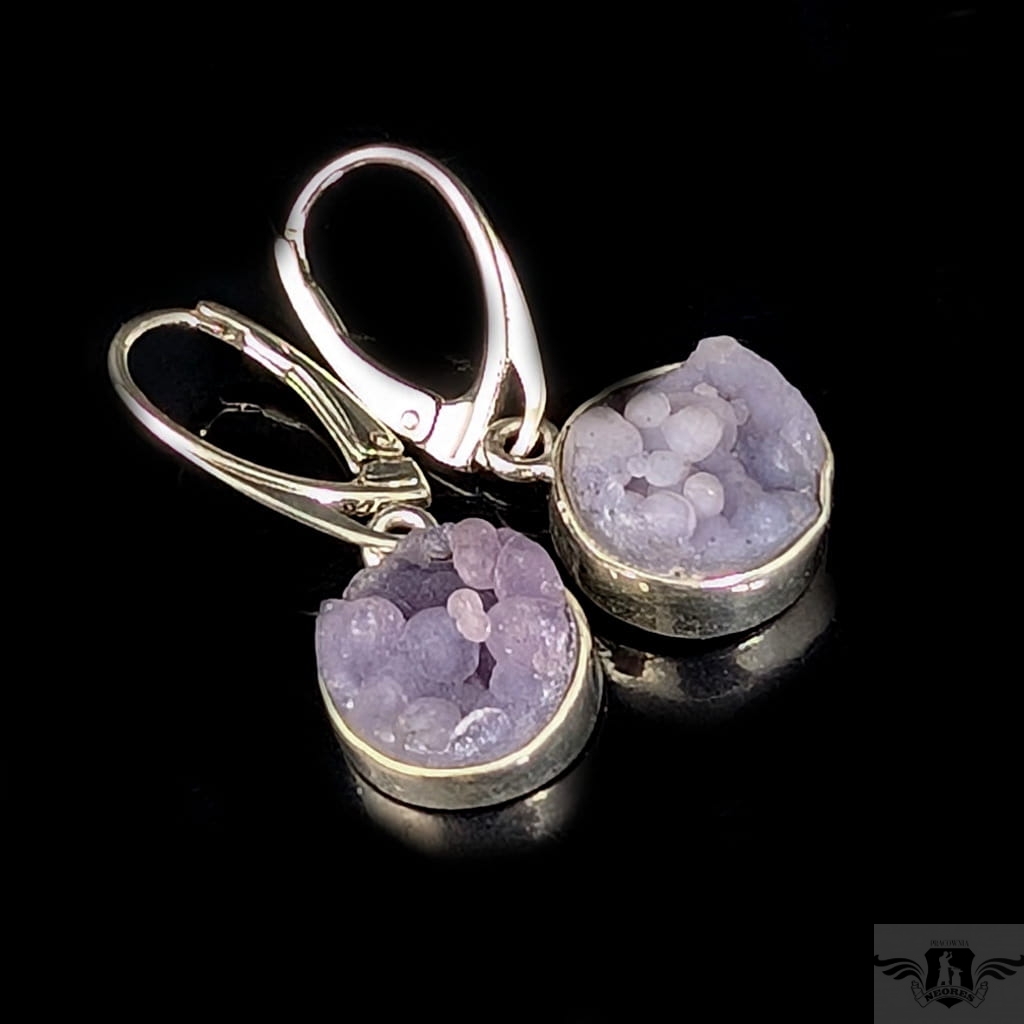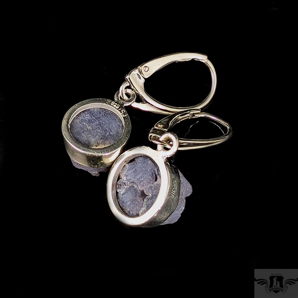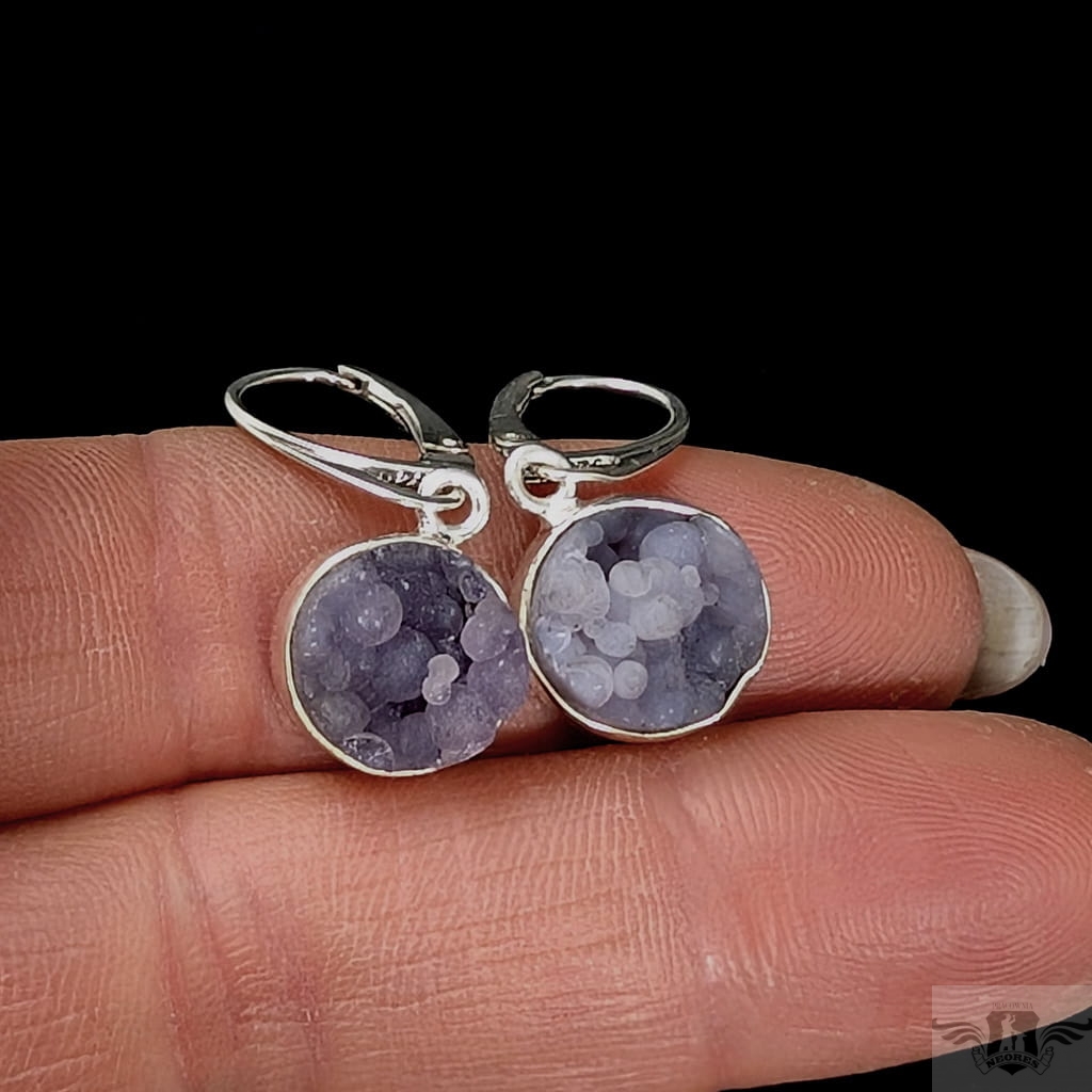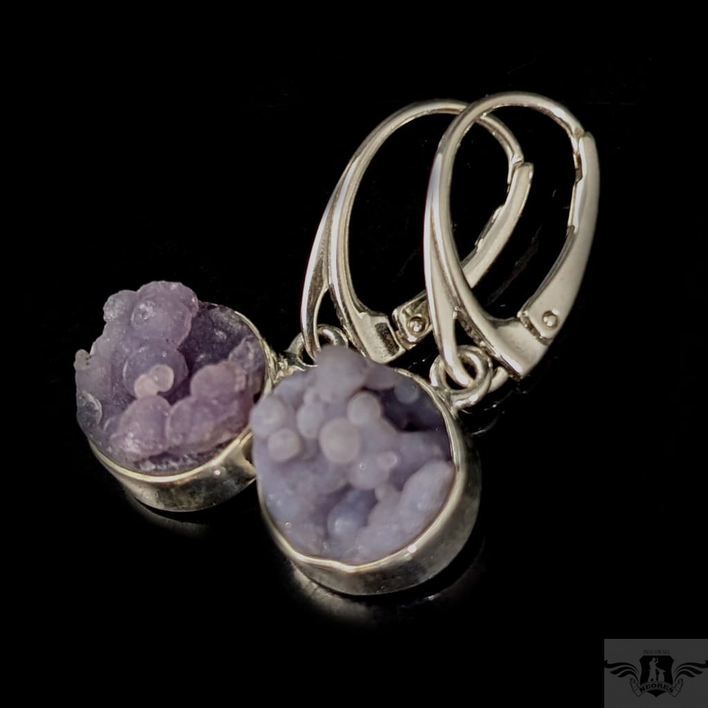 Kolczyki srebra pr 925 oraz chalcedonu winogronowego. Minerał o pięknej, stalowolawendowej barwie i budowie gronowej. Średnica12 mm. Długość max 32 mm. Waga jednego kolczyka 2,8 g. Kolczyki zostaną zapakowane w ozdobne pudełeczko.