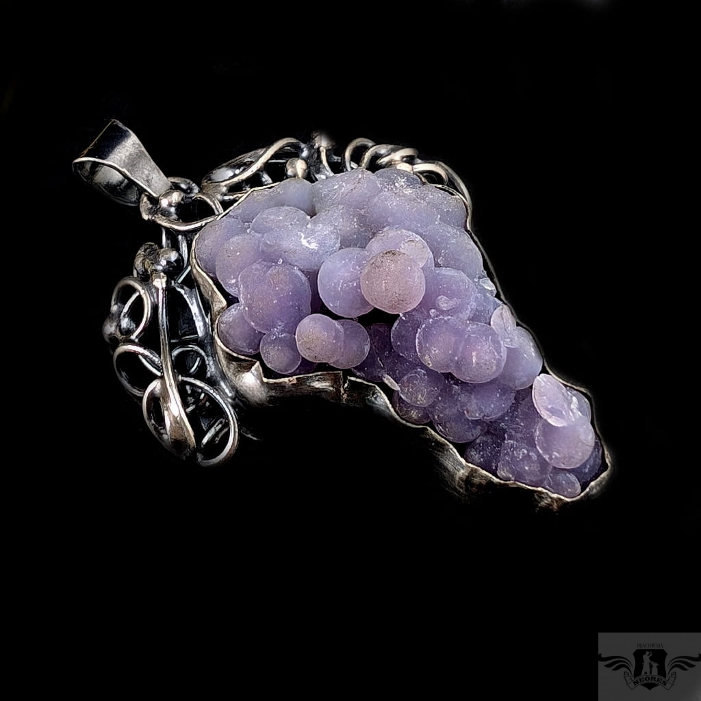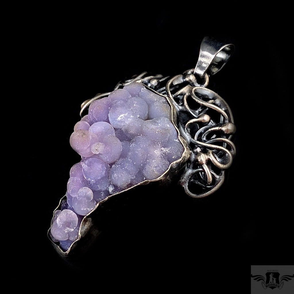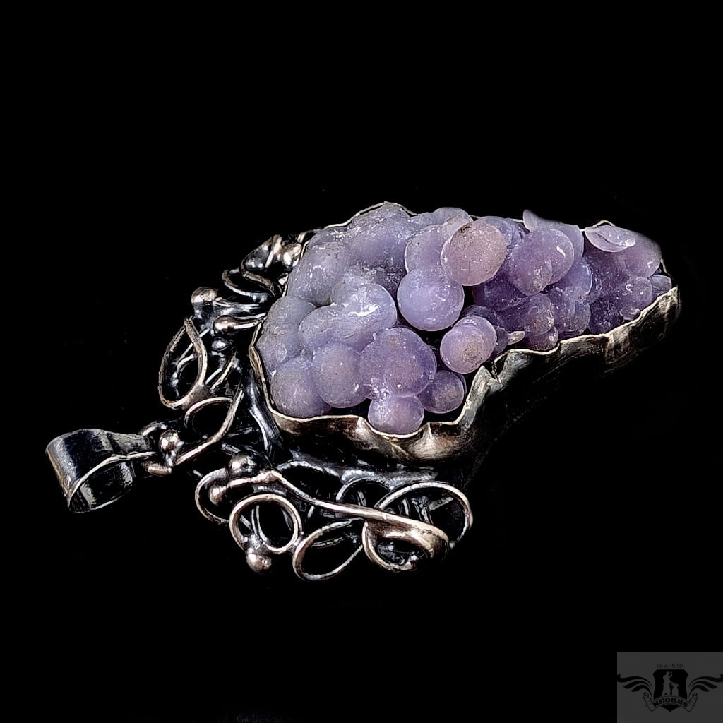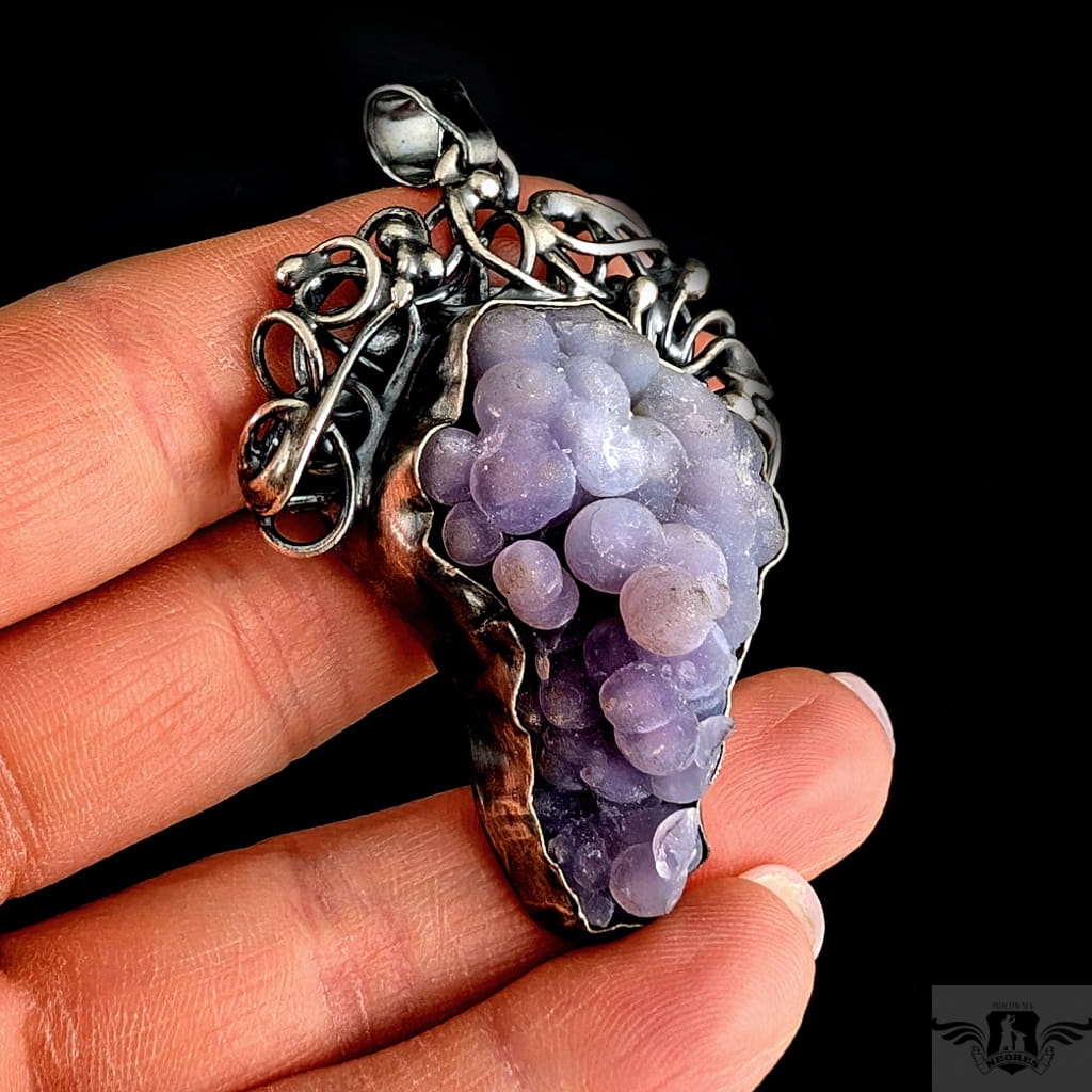 Baśniowy wisior stworzony z oksydowanego srebra pr 925, Misterne pnącza srebrnej winorośli spowijają duży okaz pięknego chalcedonu winogronowego. Minerał o pięknej, stalowolawendowej barwie i budowie gronowej. Wymiary oprawy wisiora 52 x 42 mm. Waga masywnego wisiora 33,3 grama. Wisior zostanie zapakowany w ozdobne pudełeczko.