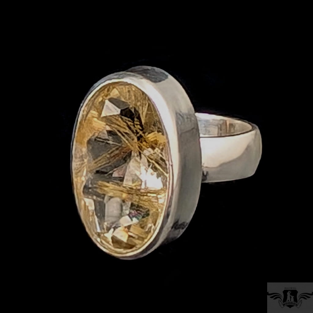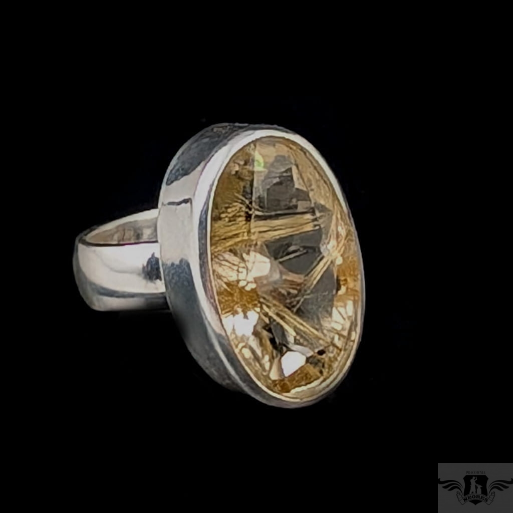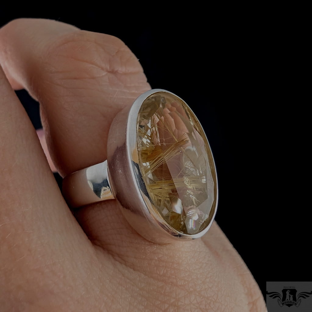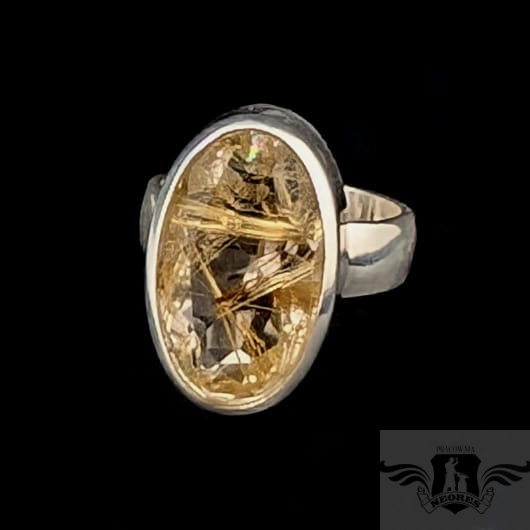 Pierścień wykonany ze srebra próby 925 oraz przepięknego ultraczystego kwarcu z wrostami złocistego rutylu. Takie mineralne zjawisko nosi nazwę włosy Wenus. Kamień o precyzyjnym, pieknym szlifie. Przepiękny okaz. Wymiary oprawy 20 x 13 mm. Rozmiar jubilerski regulowany w waskim zakresie13-17 proszę napisać na jaki dopasować. Waga 9 g. Wykonany przez dostawcę kamieni. Pierścień zostanie wysłany w ozdobnym pudełeczku.