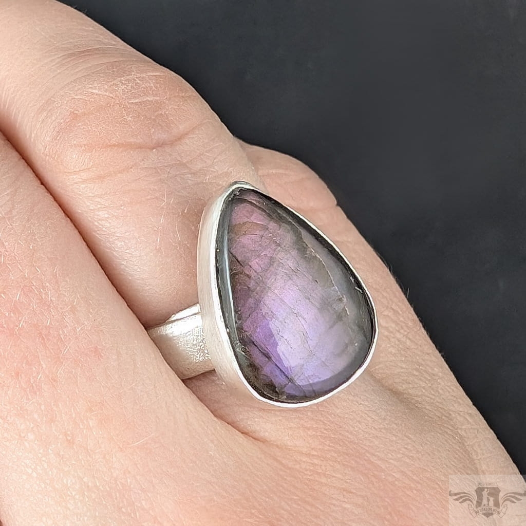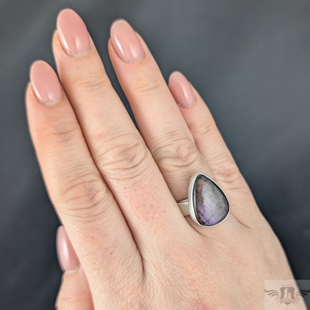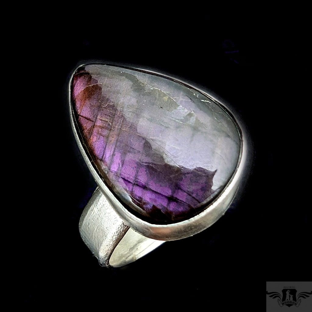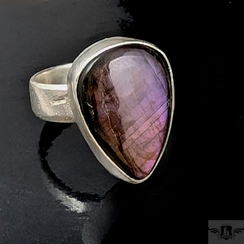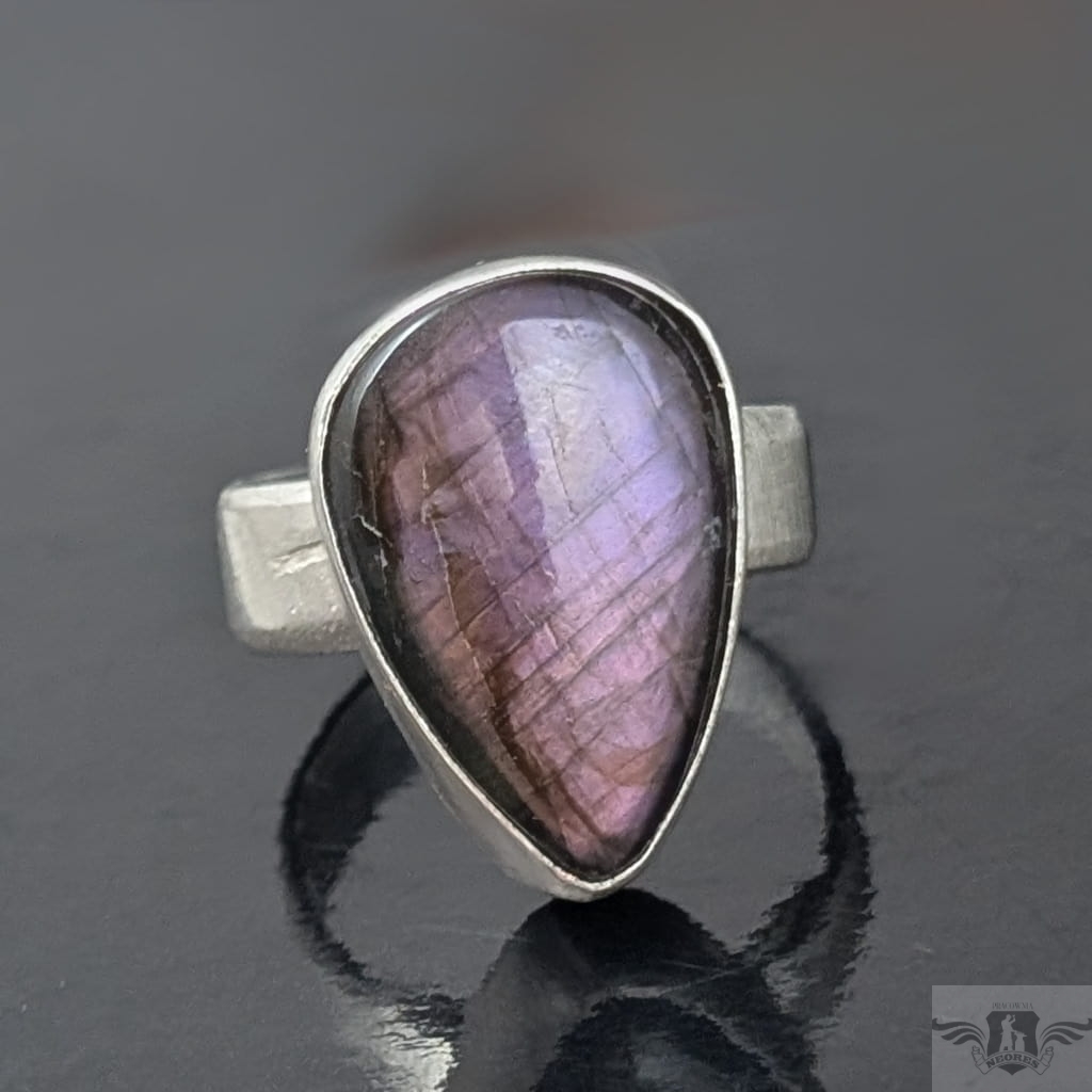 Piękny pierścień z oprawionym w srebro próby 925 naturalnym labradorytem o różowo-fioletowej tafli. Oprawa 20 x 13 mm, Rozmiar jubilerski regulowany w szerokim zakresie, proszę napisać na jaki doasować. Obrączka ma szerokość 5 mm. Waga 7.3 g. Pierścień zostanie wysłany w ozdobnym pudełeczku.