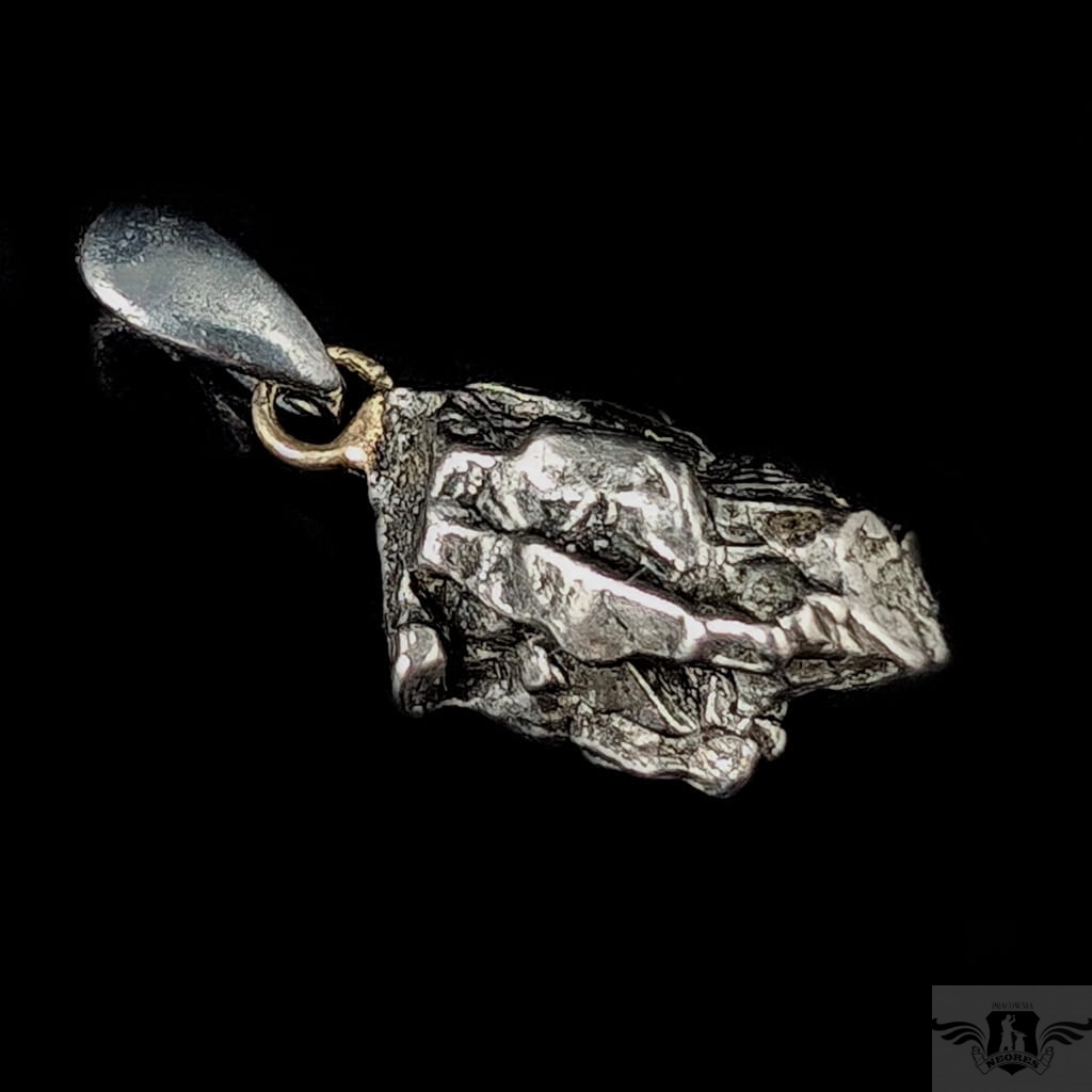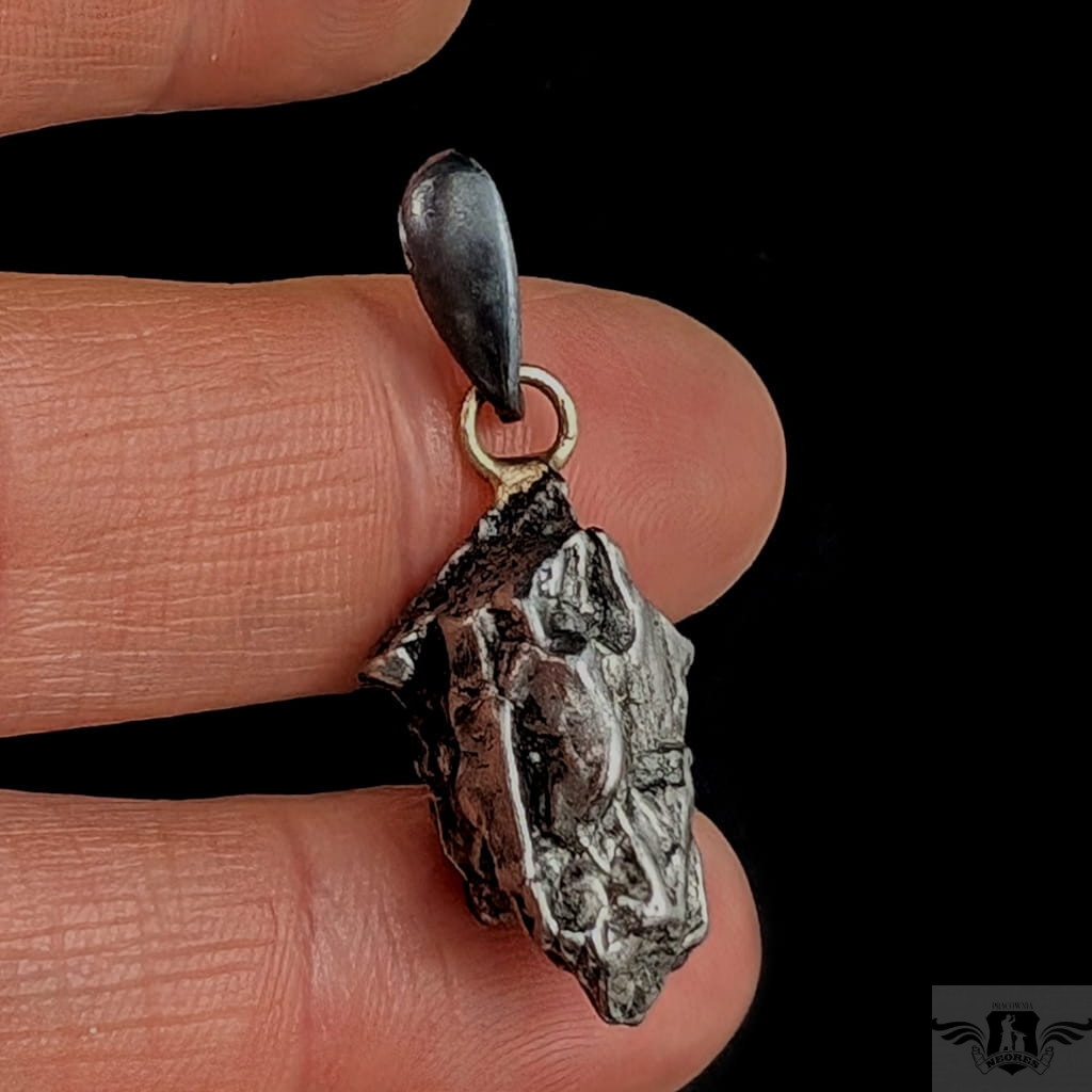 Wisiorek z meteorytem żelaznym Campo del Cielo, który znaleziono w 1576 roku w Argentynie. Meteorytom przypisywane są magiczne właściwości talizmanów. Z pewnością jest to niebanalny materiał jubilerski w ciekawy sposób zakomponowany w srebro.Uniwersalny,dla niego lub dla niej.Wymiary 22 x 13 mm, z krawatką z oksydowanego srebra długosć 32 mm, Waga wisiora 7,5 g. Wisior zostanie zapakowany w ozdobne pudełeczko.
