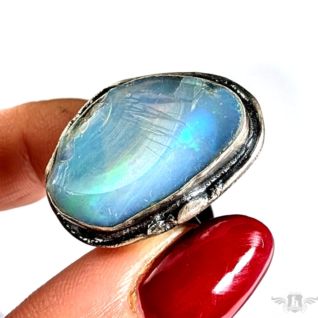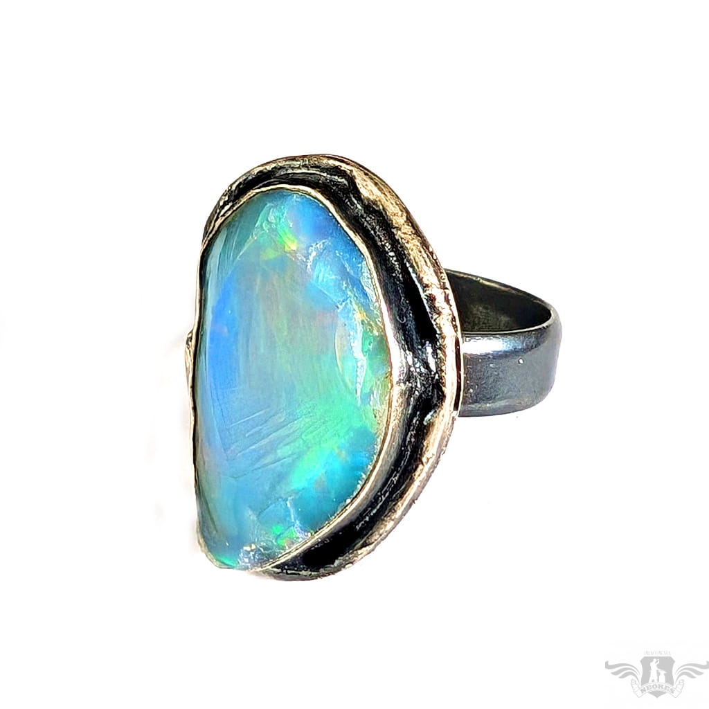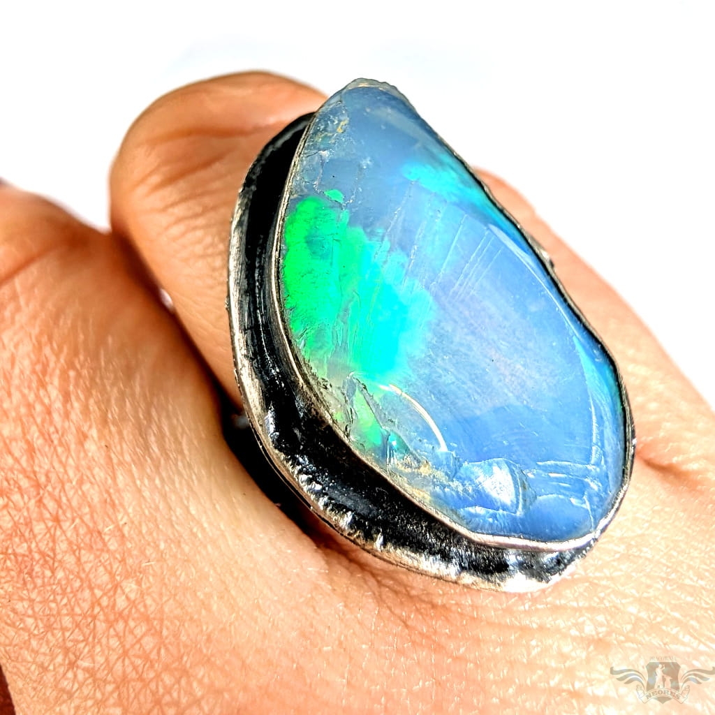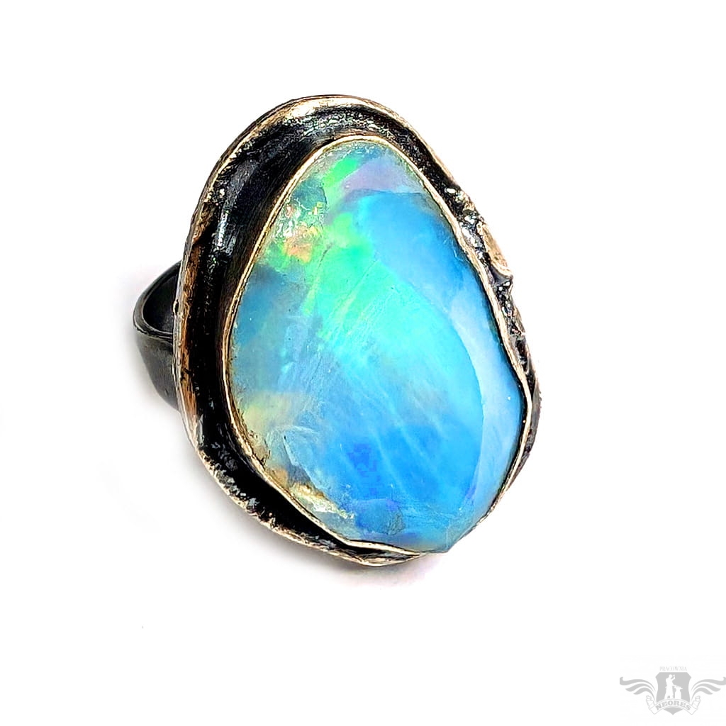 Piękny, surowy pierścień z oprawionym opalem etiopskim.Kamień o wspaniałej opalizacji barw, zjawiskowy. Piękno nie do oddania na zdjęciu. Srebro pr.925, oksydowane. Wymiary oprawy 27 x 20 mm. Waga 9 g. Obrączka regulowana w szerokim zakresie (9-26), proszę o kontakt po zakupie, to dopasuję na konkretny rozmiar. Obrączka ma 5 mm szerokości. Zapakowany w ozdobne pudełeczko.