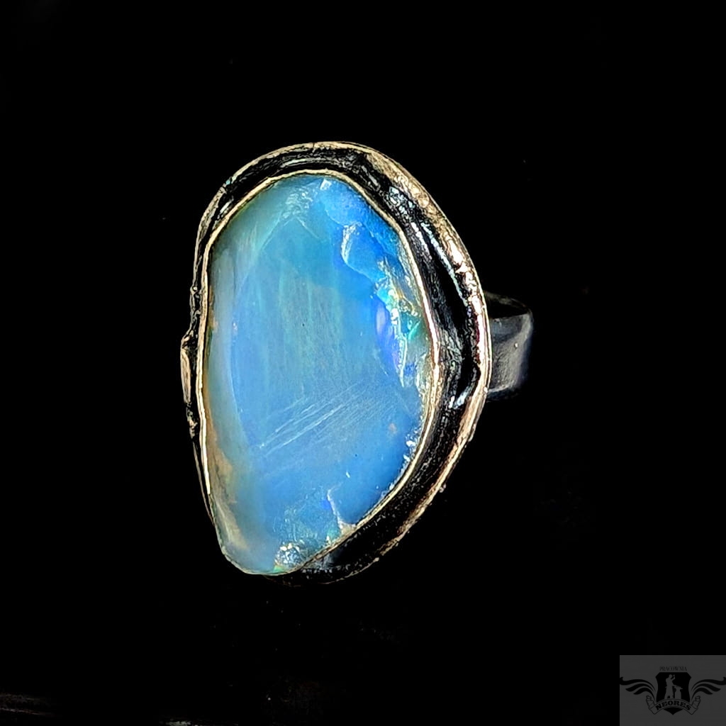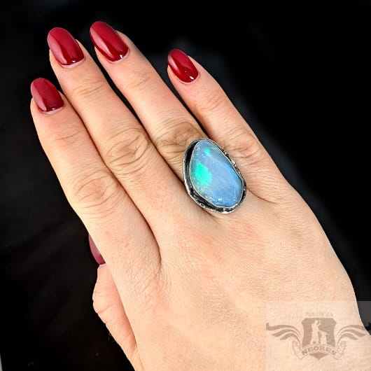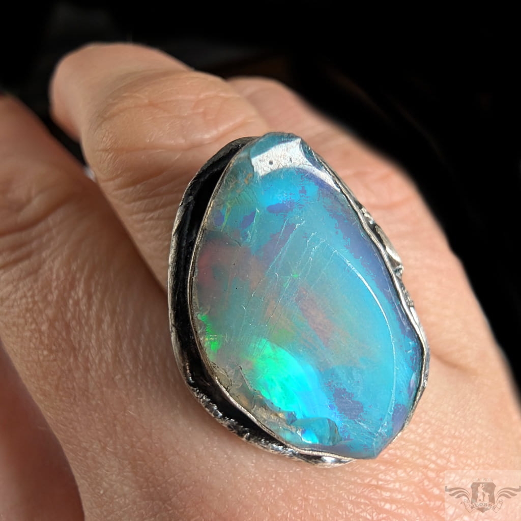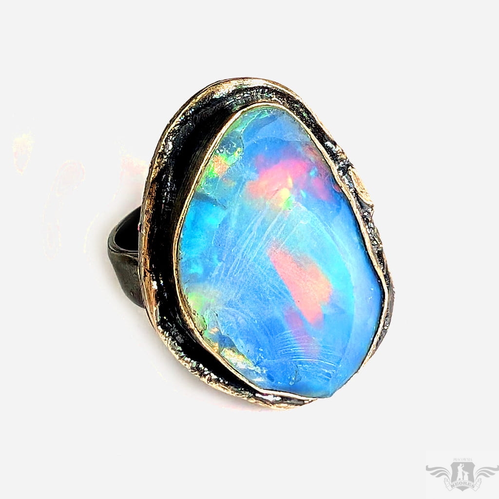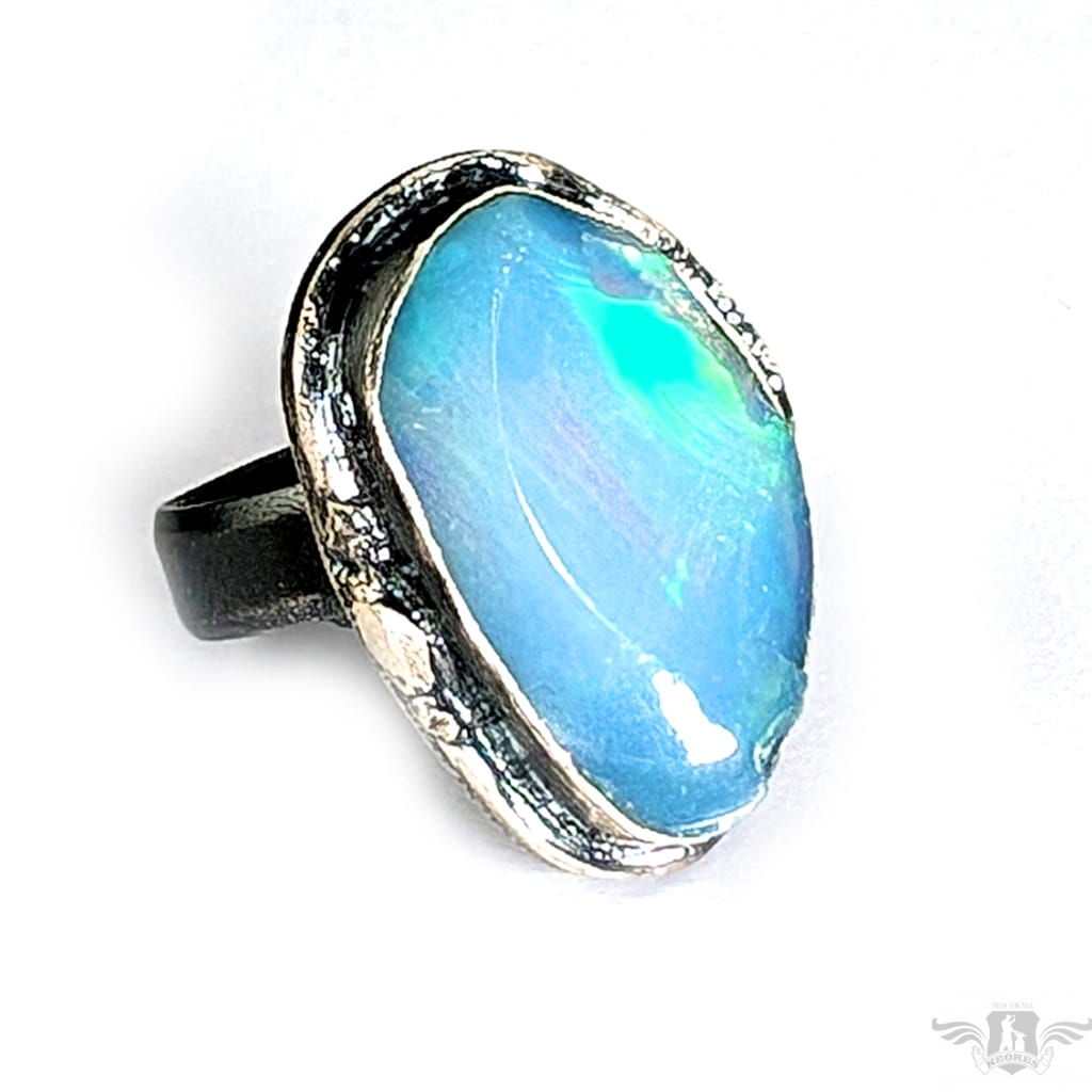 Piękny, surowy pierścień z oprawionym opalem etiopskim.Kamień o wspaniałej opalizacji barw, zjawiskowy. Piękno nie do oddania na zdjęciu. Srebro pr.925, oksydowane. Wymiary oprawy 27 x 20 mm. Waga 9 g. Obrączka regulowana w szerokim zakresie (9-26), proszę o kontakt po zakupie, to dopasuję na konkretny rozmiar. Obrączka ma 5 mm szerokości. Zapakowany w ozdobne pudełeczko.
