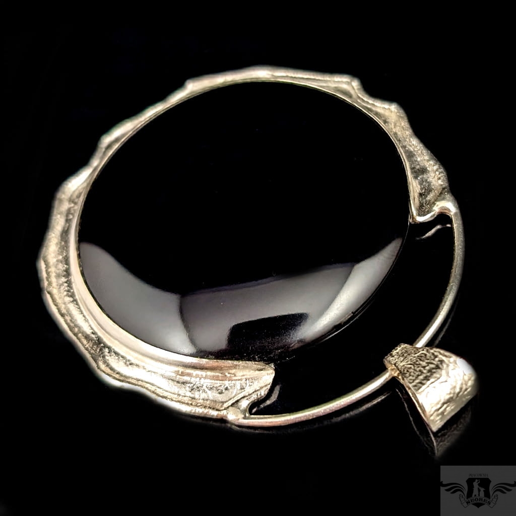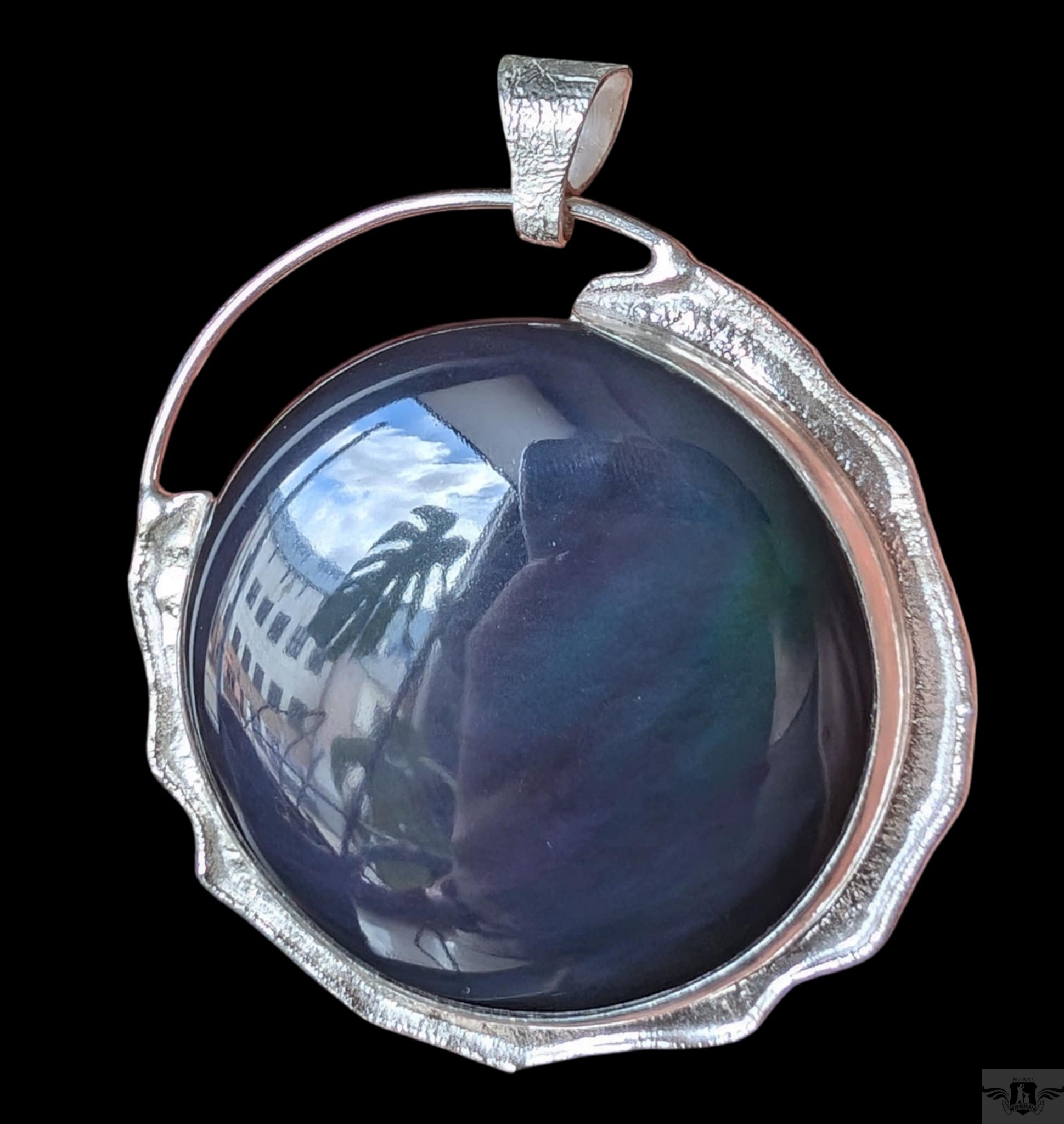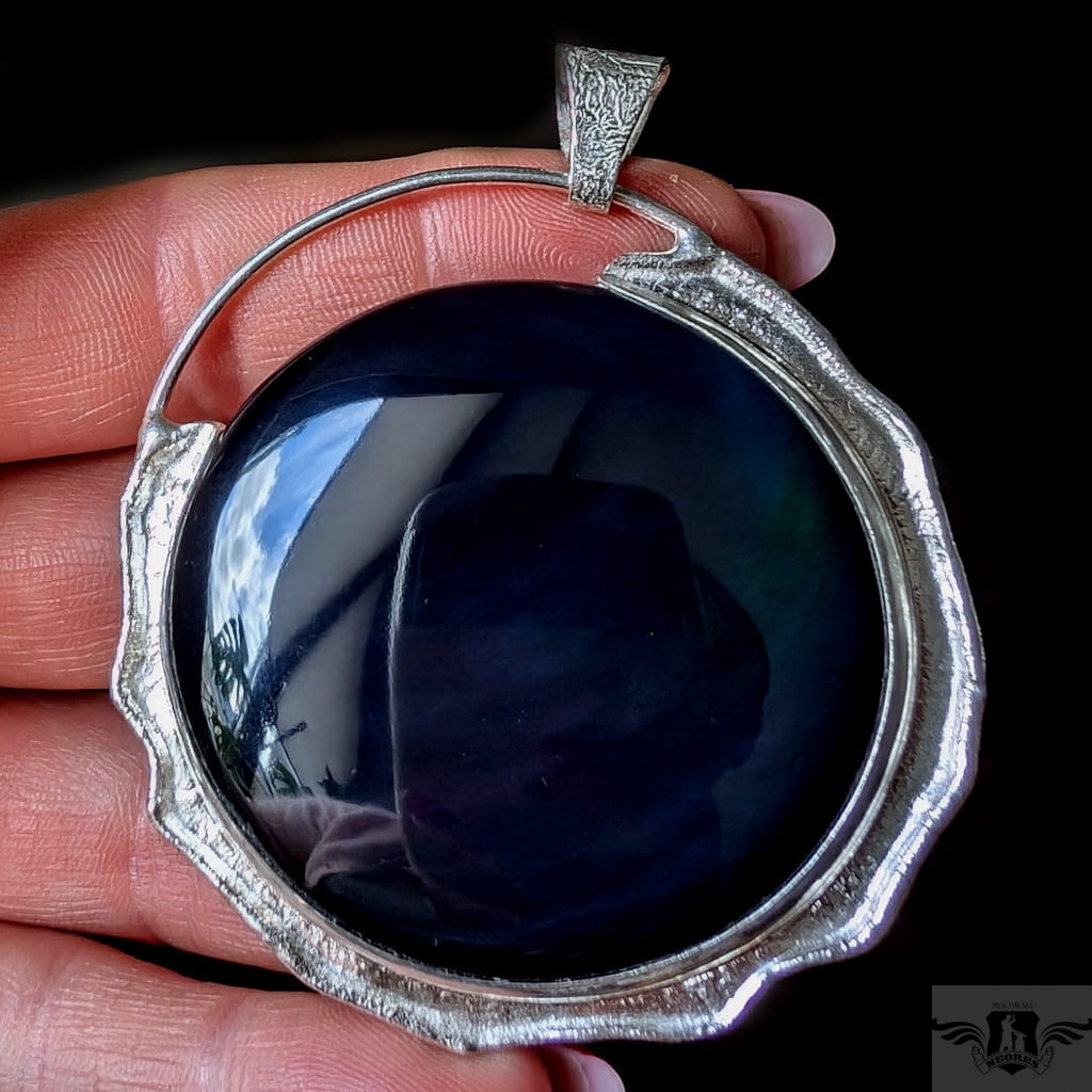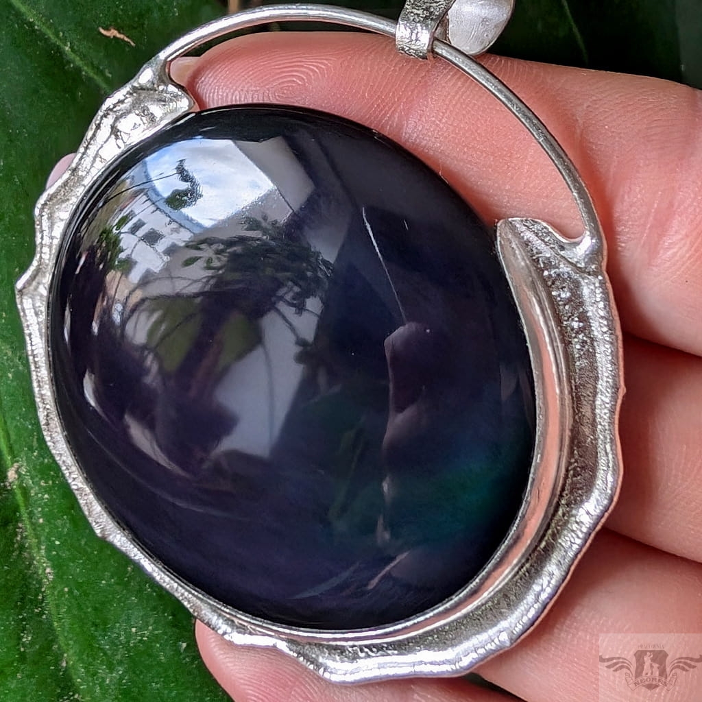 Tajemniczy wisior wykonany ze srebra próby 925 oraz niezwykłego obsydianu tęczowego. Tafla minerału gładko szlifowana, spowita elegancką, aksamitną czernią, iryzującą w przymglonych barwach: fioletu, zieleni przypominają polarną zorzę. Iryzacja ukazuje się podczas poruszenia kamieniem, pod odpowiedni kątem. Wymiary oprawy 62 x 58 mm,Średnica kamienia 50 mm, długość max 72 mm, waga 32 gramy. Tył otwarty, wisior zostanie zapakowany w ozdobne pudełeczko.